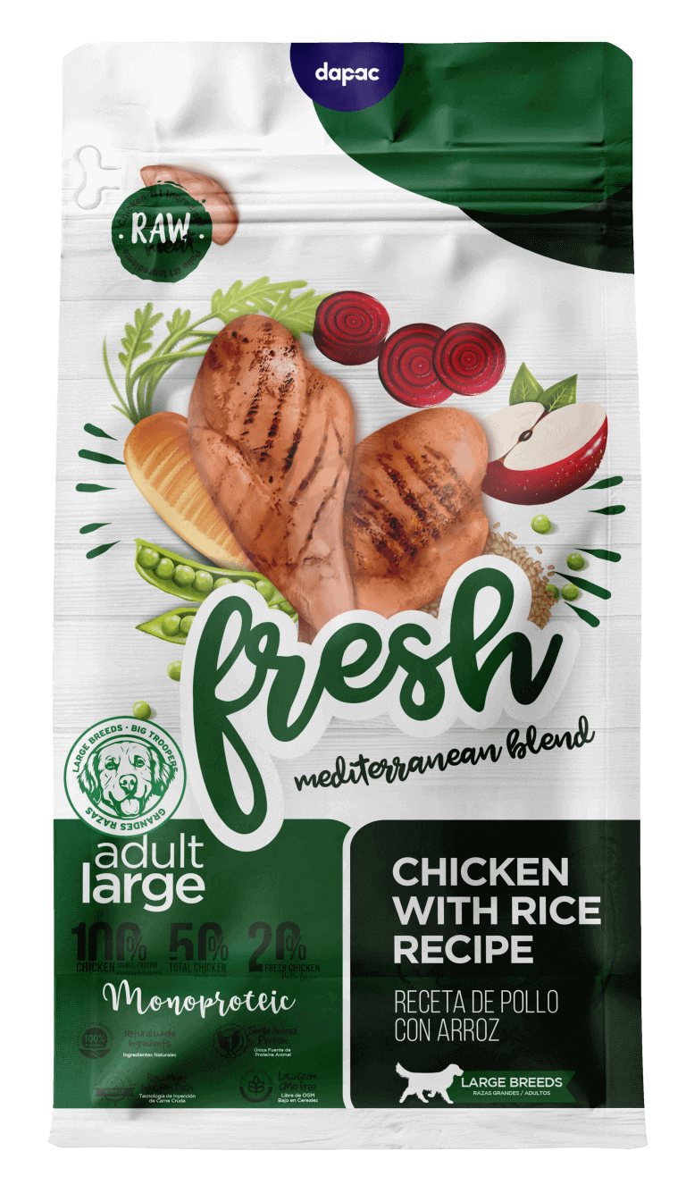 La variedad Adult Complete de Fresh Mediterranean Blend es una receta pensada indicada para perros de todas las razas en edad adulta. La receta contiene verdadero pollo y es bajo en cereales. Sus principales ingredientes son pollo deshidratado, pollo fresco 20% y arroz.