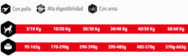 Composición: Proteína de carne deshidratada 30% (pollo 4%), trigo, subproductos de origen vegetal (pulpa de remolacha 1,5%), grasa de ave, arroz 4%, cebada, vaina de algarroba, sustancias minerales y vitaminas.