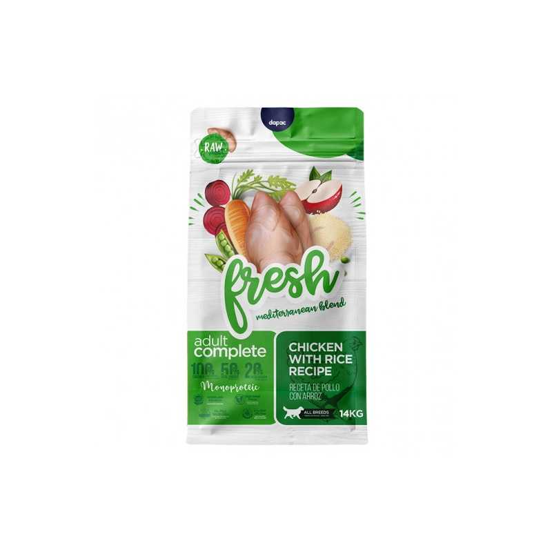 La variedad Adult Complete de Fresh Mediterranean Blend es una receta pensada indicada para perros de todas las razas en edad adulta. La receta contiene verdadero pollo y es bajo en cereales. Sus principales ingredientes son pollo deshidratado, pollo fresco 20% y arroz.