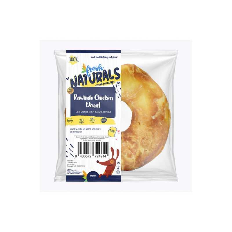 Fresh Naturals incorpora a su amplia gama de snacks el donuts de pollo para perros. Un aperitivo masticable que además de tener un alto nivel de palatabilidad, es eficaz frente a la placa y el sarro. Esto es, a la vez que tu perro disfruta y está entretenido, está favoreciendo su salud bucodental.