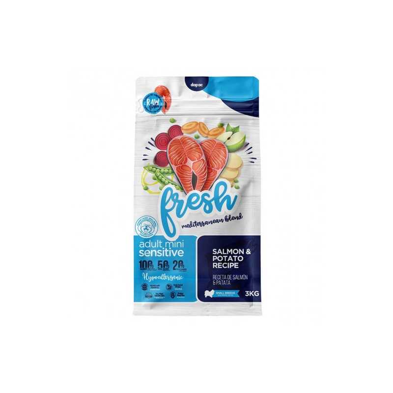 La variedad Adult Sensitive de Fresh Mediterranean Blend es una receta pensada especialmente para perros adultos de todas las razas. La receta incluye verdadero salmón y no contiene harina de carne o pescado. Sus principales ingredientes son salmón deshidratado, salmón fresco 20%, patata y arroz.
