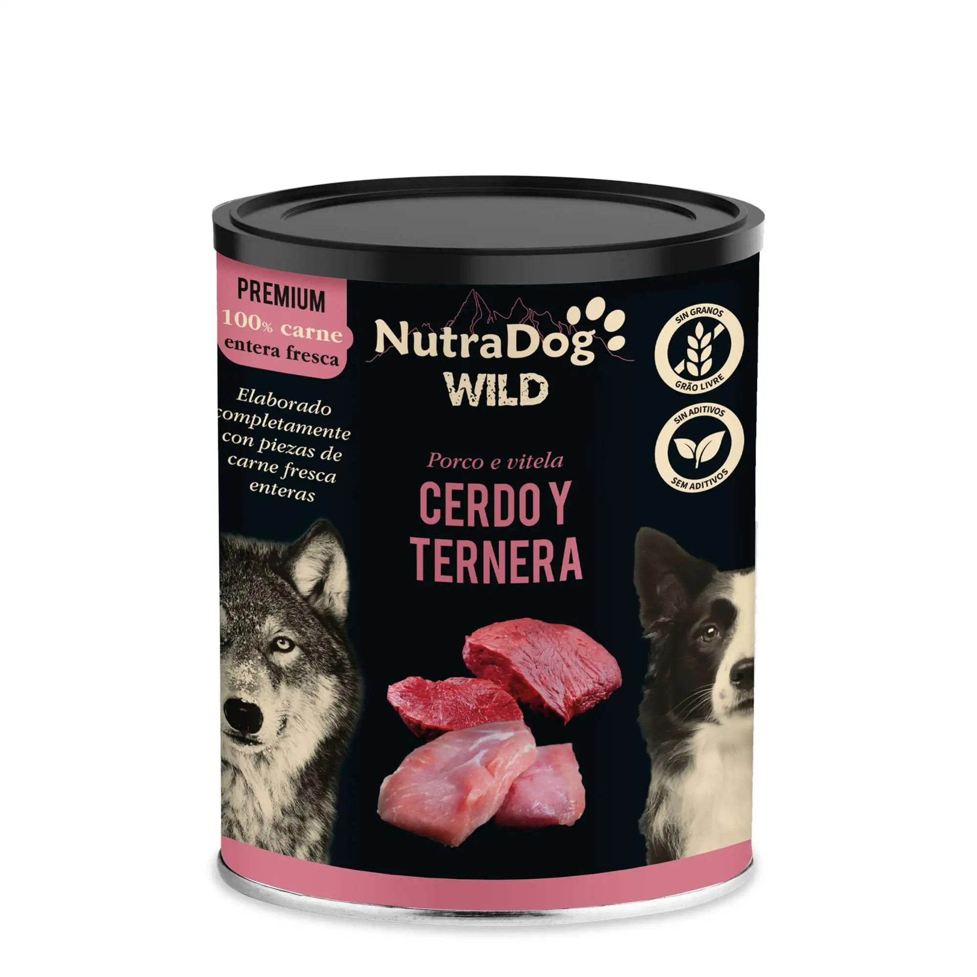Alimento húmedo para perros 100% natural, elaborado únicamente con carne de ternera y cerdo deshuesadas. Los perros son animales carnívoros y necesitan una dieta rica en carne y grasas de calidad para satisfacer sus necesidades proteicas. Este alimento está compuesto por piezas enteras de ternera y cerdo deshuesadas, sin aditivos ni ningún otro ingrediente.