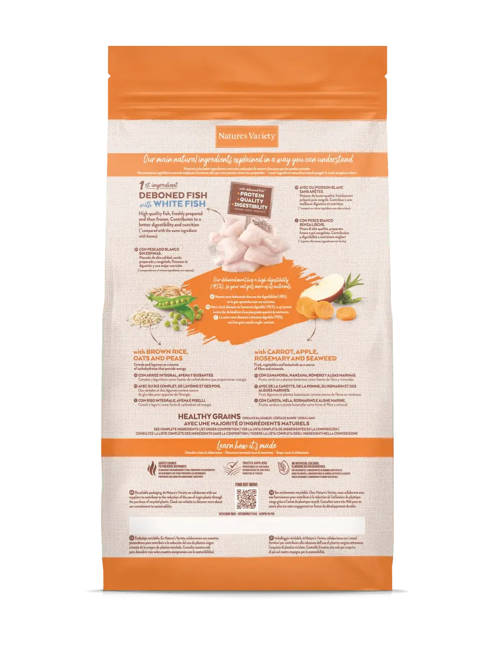 Pescado blanco sin espinas* (bacalao y otros pescados de temporada) (20%), proteína deshidratada de atún (13%), guisantes deshidratados* (13%), proteína de maíz, proteína de patata, arroz integral* (6%), avena* (6%), grasa avícola* (4%), pulpa de remolacha*, proteínas animales hidrolizadas (ave, cerdo, pescado) (3%), fibra de guisante*, sustancias minerales, zanahoria deshidratada* (0,5%, equivalente a un 4% de zanahoria fresca), manzana deshidratada* (0,3%, equivalente a un 2% de manzana fresca), algas marinas deshidratadas (kelp)* (0,01%), romero deshidratado* (0,01%). *Ingredientes naturales.