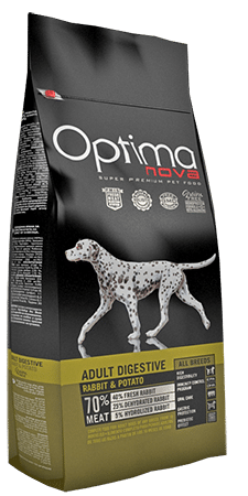 Optimanova Adult Digestive Rabbit & Potato es el único producto del mercado en su categoría que está hecho a base de carne de conejo fresco. Fácil de digerir, sabroso y bajo en calorías, colesterol y grasas, también contiene importantes minerales como hierro, magnesio y zinc., El Omega-3 ayudará a mantener su piel sana y su pelaje brillante. Es perfecto para cualquier tipo de raza. Especialmente para las que tienen digestiones delicadas.