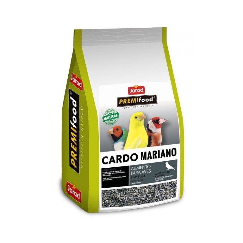 Las semillas de cardo mariano proceden de la planta del mismo nombre que crece de manera natural en la mayor parte de Europa. Junto con otros tipos de cardo, el cardo mariano forma parte de la dieta natural de los jilgueros y es una de sus semillas preferidas. Además de formar parte de su dieta, las propiedades del cardo mariano lo hacen especialmente recomendable tanto para el jilguero como para canarios y otros pájaros silvestres de alimentación parecida.