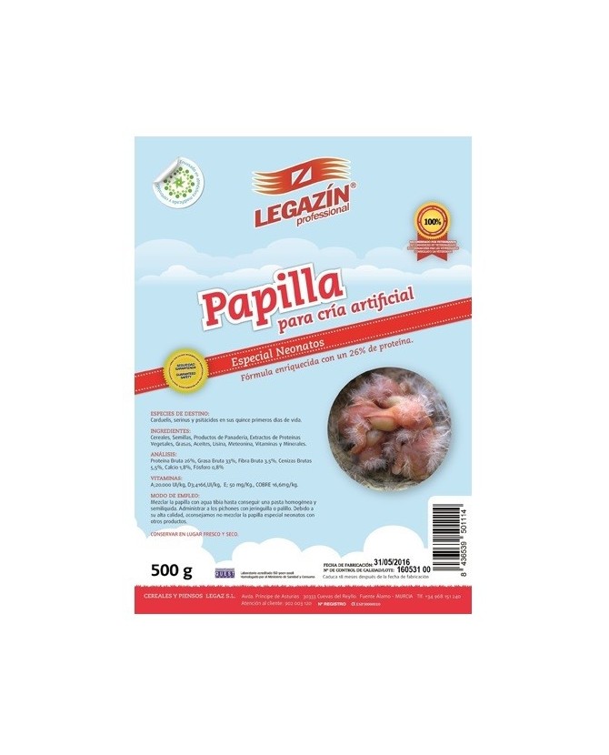 Legazin neonatos es una papilla especial para carduelis, serinus y psitácidos en sus primeros 15 días de vida. Garantiza un crecimiento rápido y saludable de los polluelos de canarios, jilgueros y otras aves.