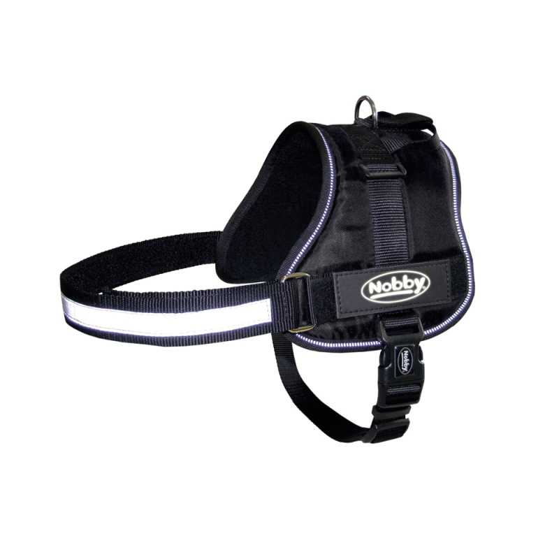 El arnés Nobby ofrece no solo una comodidad óptima a través de su forma ergonómica, sino también más seguridad para el perro y el dueño. Es ideal para correr con su mascota en la oscuridad: con este arnés con tiras reflectantes tejidas altamente visibles, una correa para el pecho reflectante y pegatinas reflectantes de velcro, su perro es especialmente visible. Llama la atención sobre este arnés las divertidas etiquetas laterales que se pueden reemplazar con superficies de velcro (se venden por separado). Es particularmente duradero y está equipado con forro polar. Debido al revestimiento con tela de nylon, es resistente a la suciedad y al agua, por lo que es perfecto para el uso diario. Una correa para la muñeca permite sujetar el arnés rápidamente, pero puede, Si el perro no tiene una correa, fíjelo con una superficie de velcro. El cinturón abdominal y del pecho es infinitamente ajustable y la forma especial del arnés hace que sea fácil y rápido de poner. Tiene dos ojales de plástico para sujetar accesorios.