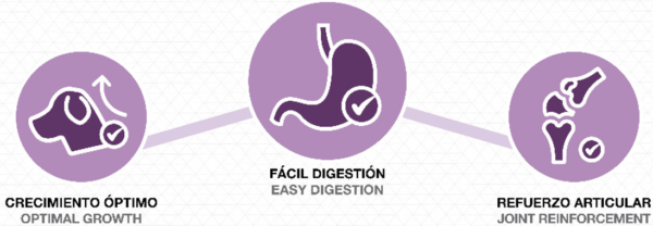• Glucosamina y sulfato de condrotina, suplementos para mantener y reforzar la salud de las articulaciones durante el crecimiento del cachorro.