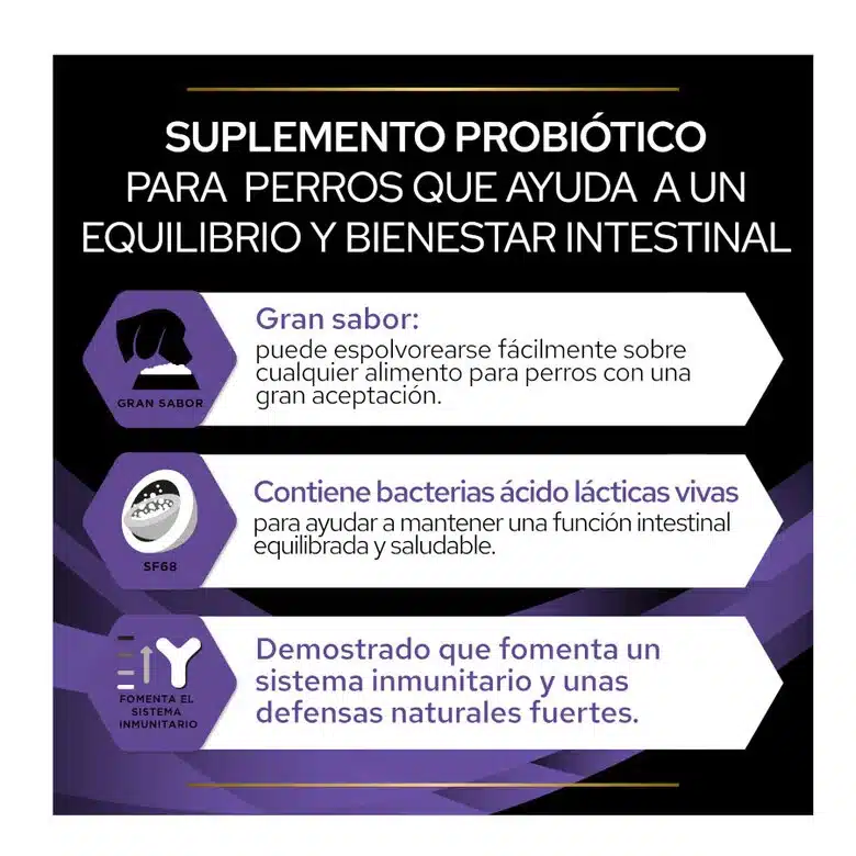 Probiótico para perros. Alimento complementario para perros y cachorros para ayudar a mantener el equilibrio y bienestar intestinal. Contiene bacterias ácido lácticas vivas para ayudar a mantener una función intestinal equilibrada y saludable.