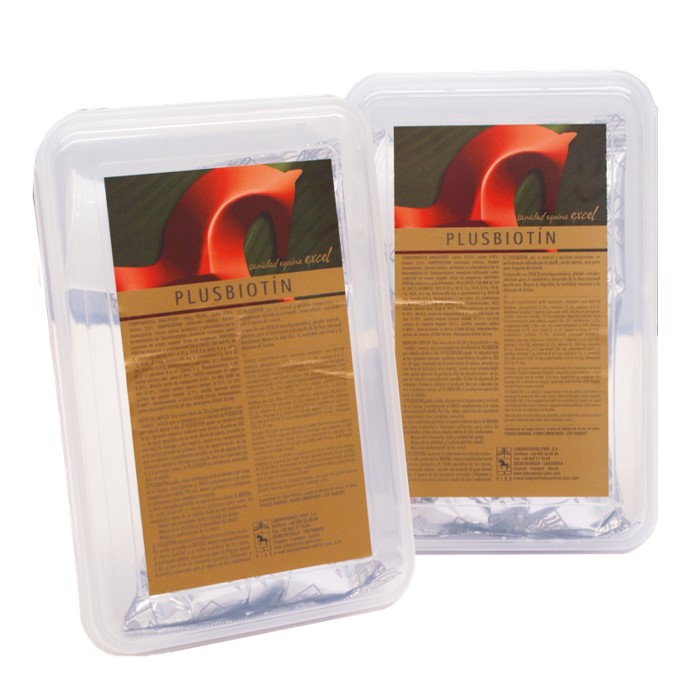 La suplementación con BIOTINA asegura el desarrollo y mantenimiento del casco, sólido, sin fisuras, bien liso, sin surcos, así como una correcta renovación de todas las estructuras que contienen tejido querático, como es el caso del pelo de las crines y del manto. PLUSBIOTIN produce espectaculares mejoras en caso de cascos rotos y astillados, si se es constante en la administración al menos durante 2 a 3 meses.