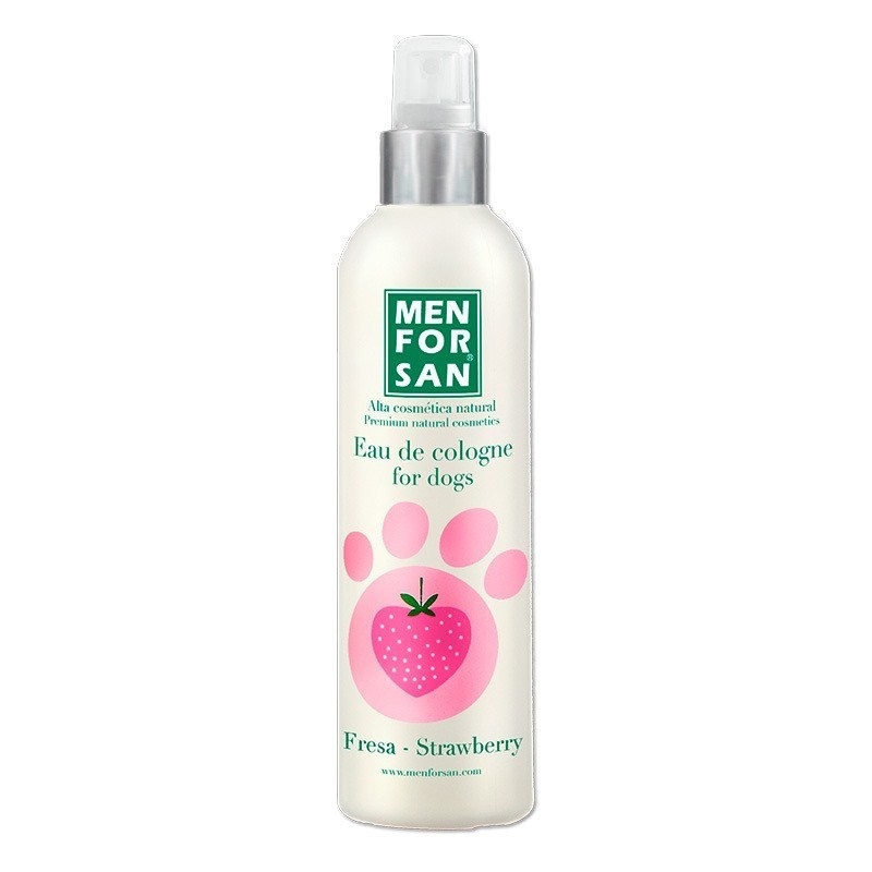 Agua de colonia fresa para perros con fragancias frutales naturales especialmente creadas para proporcionar después del baño un olor fresco y un intenso efecto desodorante muy agradable respetando la piel y las propiedades olfativas del animal. No contienen alcohol y tienen ph neutro, careciendo de efectos irritantes y evitando que el perro estornude después de su aplicación.